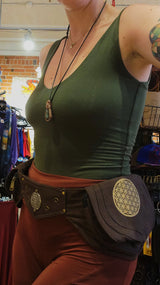 This pocket belt features two main compartments, both having one zippered pocket on the inside as well as a secret zippered pocket on the back. It also features gold hardware, a flower of life pattern on each pocket, and an adjustable waist to ensure the perfect fit!
