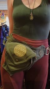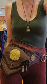 This cloth pocket belt has one compartment with two zippered pockets inside and one secret zippered pocket on the back. It also features gold hardware, a flower of life pattern on the front and side, and an adjustable waist to ensure the perfect fit!
