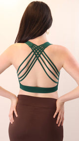 The front features a soft scrunch detail that enhances shape without padding, while the wide straps provide a secure, comfortable fit. Turn around, and the standout feature shines: a beautifully detailed X-back with slender, crisscrossing straps that add breathability, stability, and a touch of bold elegance.