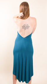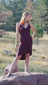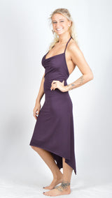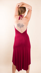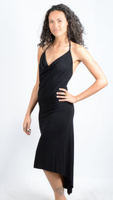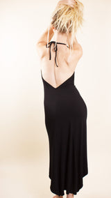 With a V-shaped open back and a halter cowl neck, this dress is perfect for the beach, lounging, or special occasions. Fitted with a longer hemline in the back, and shorter hemline in front this dress flows with graceful movement- a perfect statement piece for dancing at a festival, or a swanky cocktail party.