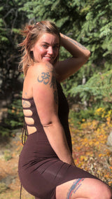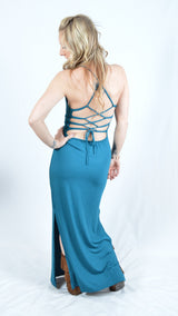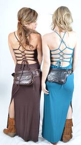 A comfortable and sensual floor length dress, Umba's Long Strappy Dress is fitted with spaghetti straps that tie into an open corseted back. Can be tied as tight or loose as you like for a custom fit. Stylish slits up the side of each leg allow for an ease of movement and a sassy flair. Perfect for dance and music festivals!