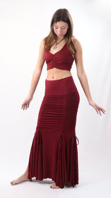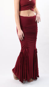 This effortlessly chic boho-inspired maxi skirt features soft, stretchy fabric that flatters every curve. The ruched detailing down the front and sides creates a flowing, layered silhouette that moves beautifully with you. Adjustable drawstrings let you customize the length and drape for a perfectly unique look.