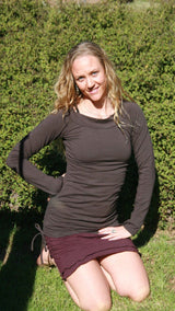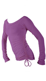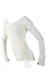 Long sleeves; cinched at the sides. This top hugs the body for a super flattering fit. Made extra long to keep your core warm but can be easily cinched up for a shorter look. 97% cotton with just a touch of Spandex for comfort and stretch. Versatile!